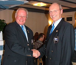 Ehrenvorsitzender wieder auf Kommandobrücke der Rudergesellschaft Gunter Mayer (r.) gratuliert seinem Nachfolger im Amt des ersten Vorsitzenden. (Foto:Wartner)(jc) (ewa) Vorstandswahlen standen im Mittelpunkt der diesjährigen Jahreshauptversammlung der Rudergesellschaft. Nach einem Jahrzehnt verließ Gunter Mayer die Kommandobrücke und übergab die Führung des RGE-Schiffes an Robert Moray, einem Sturm erprobten Kapitän. War er doch bereits von 1971 bis 1981 RGE-Vorsitzender und wurde aufgrund seiner vielseitigen Verdienste 1989 zum Ehrenvorsitzenden ernannt. "Aus großer Verbundenheit zur RGE" übernahm er jetzt erneut für die nächsten zwei Jahre den Vorsitz, weil sich trotz intensivster Bemühungen kein anderer dazu bereit erklärt hatte. Sein Vorschlag, dieses Amt künftig nur noch zeitbegrenzt zu vergeben - etwa wie bei den Lions und Rotariern auf zwei Jahre - fand allgemeine Zustimmung. Dann, so Moray, werde es leichter sein Nachfolger zu finden. Nach einstimmig erfolgter Wahl erklärte er, dass er sein Möglichstes dazu beitragen werde, damit das RGE-Schiff weiterhin "flott über alle Wogen gleiten könne". Besonderes Augenmerk will er auf die Förderung der Jugend legen.