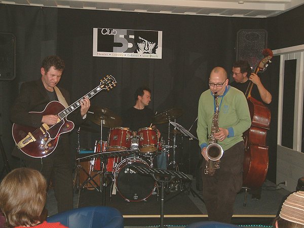 Bernhard Sperrfechter bleibt seiner Linie treu - Combospiel auf Topniveau (Foto:Wörner)(tw) (ra) Auch im sechsten Jahr scheint es der Jam-Reihe zu gelingen, jene prickelnde Atmosphäre zwischen cooler Professionalität und spontanem Spielwitz zu erzeugen, wie sie für den "echten" Jazz so typisch ist. Spukte vielen treue Fans noch ein wenig das Badhaus-Kellergewölbe durch den Kopf, richtete sich auch im völlig anders gestylten "Club 55" die Aufmerksamkeit schnell auf die Combo, die sich nun auf einer richtigen kleinen Bühne einrichten konnte.