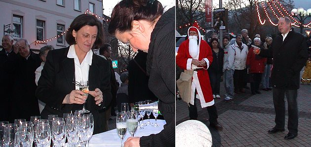 Nach langer Durststrecke ein Glas Sekt auf die Friedrichstraße Dietrich Müller (r.) freute sich mit den Gästen der Feierstunde auf dem Leopoldsplatz über die "neue" Friedrichstraße. (Fotos:Richter)(hr) Seit 23. November kann der Verkehr in der neu gestalteten Friedrichstraße wieder fließen. Auf einen offiziellen Festakt zur Freigabe nach rund 14-monatigen Bauarbeiten wurde damals verzichtet. Gestern aber wurde dann doch noch mit einem Glas Sekt in einer kleinen Feier auf die "neue" Straße angestoßen.