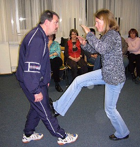 Die Verhaltenstrainer Bernd Grimm und Uwe Franek lieferten im Kurs "Handfestes", Übungen zu Wahrnehmung und Körpersprache sowie Informationen. Es ging um eine ganze Palette von Selbstbehauptung und Gegenwehr. Die Schwerpunkte lagen auf der frühzeitigen Wahrnehmung von beleidigenden und bedrohlichen Situationen, Selbstbehauptungsstrategien für spezielle Situationen, Gegenwehr bei körperlichen Belästigungen und verbalen Angriffen, juristischen Informationen (Opfer-Täter-Beziehung, Notwehrgesetzgebung), Möglichkeiten des Eingreifens ohne sich selbst zu gefährden und mentalem Training.