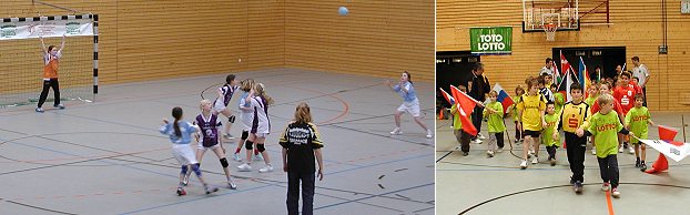 Beide E-Jugendmannschaften bei Heimspieltag aktiv (Fotos:Claussen)(jc) Beide E-Jugendmannschaften der SGH Waldbrunn/Eberbach waren am Wochenende bei Heimspielen in der Hohenstaufen Sporthalle aktiv. Bevor der Heimspieltag aber losging, wurden die Mannschaften von den Nationalflaggen der 24 WM-Teilnehmerländer beim Einlauf eskortiert. Die Jungen mussten gegen den TSV Steinsfurt antreten und unterlagen nach Toren mit 4:14. Die Mädchen unterlagen Sinsheim nach Toren mit 7:12. Auch nach Multiplikation mit der Anzahl der Torschützen änderten sich die Ergebnisse in der Sache nicht.