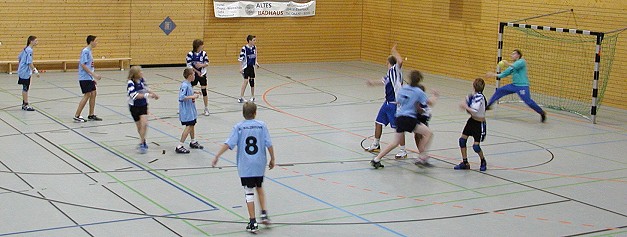 Trauben in der Leistungsklasse hängen hoch (Foto:Claussen)(jc) Die Trauben für die männliche C-Jugend in der Leistungsklasse hängen noch sehr hoch. Am Samstag unterlag das junge Team der FT Kirchheim deutlich mit 16:33. Die Gäste waren den Jungen aus Eberbach und Waldbrunn dabei in allen Belangen überlegen. Nur die beiden Torsteher waren ihrem gegenüber ebenbürtig und verhinderten mit sehenswerten Reflexen eine noch höhere Niederlage. Auch wenn die SGH-Jungs, zumindest mit Einzelaktionen, technisch ansehnlichen Handball zeigten, fehlte es für diese Spielklasse eindeutig noch an Cleverness. Haarsträubende Wiederholungsfehler im Angriff, sowie viel zu ängstliches Operieren in der Abwehr machten ein besseres Ergebnis unmöglich. Der Gegner musste nur auf die Fehler im SGH-Team vertrauen. Trotz der Niederlage muss die Truppe den Kopf nicht hängen lassen, da das Potential im Team noch nicht ausgeschöpft sein sollte.