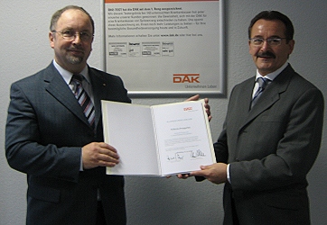 Ehrung für treue Dienste am Kunden (Foto: privat)(bro) (gb) Am 1. Dezember 2006 feierte Wilhelm Preugschat bei der DAK in Eberbach sein 40-jähriges Dienstjubiläum. Während einer Feierstunde gratulierte Helmut Bötz, stellvertretender Chef der DAK in Baden Württemberg, dem Bezirksgeschäftsführer und überreichte ihm im Namen des Vorstandes die goldene Ehrennadel der DAK. Er dankte Preugschat für sein Engagement und die treuen Dienste am Kunden.