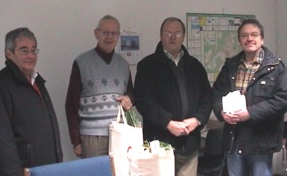 Weihnachtsfreuden von der AWO V.l. Ludwig Neuer, Günther Ihrig, Helmut Raab und Roman Krawczyk bei der Spendenübergabe. (Foto:C.Richter)(cr) Bereits seit über 26 Jahren beschenkt die Arbeiterwohlfahrt (AWO), Ortsverein Eberbach, in der Vorweihnachtszeit Bürgerinnen und Bürger in Eberbach und den Ortsteilen, Menschen, die nicht unbedingt auf der Sonnenseite des Lebens stehen. Gertrud Stimmel und Alois Fath besorgten Produkte, die von Petra Kuhnt und Ute Ihrig liebevoll verpackt wurden und heute von Roman Krawczyk und Günther Ihrig zu 40 Familien oder alleinstehenden Personen gebracht werden.