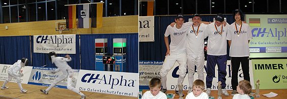 Als Zaungast war auch Jörg Fiedler, Mitglied des deutschen Fechtteams und führender der deutschen Rangliste in der Hohenstaufen Sporthalle. Grußworte überbrachten Markus Bracht, Vorsitzender des Fechtclubs Mosbach, der als Geburtstagskind anschließend selbst ein Geburtstagsständchen von den Rängen entgegen nehmen durfte, der Landrat des Neckar-Odenwald-Kreises, Dr. Achim Brötel und Bürgermeister Bernhard Martin. Als Hauptsponsor ermöglichte die Eberbacher Gelita AG die Vergabe der Meisterschaft nach Eberbach. Der CH-Alpha-Cup wird bereits zum neunten Mal ausgefochten. Als Vertreter der Gelita AG nahm Stefan Ruhm die Siegerehrung mit den weiteren Ehrengästen vor.