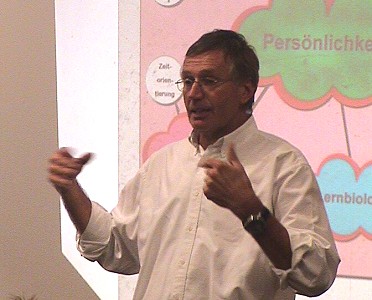 In seinem Vortrag erläuterte Bauer, wie Offenes Lernen aussehen kann und warum es wichtig ist, den Kindern die Möglichkeit zu geben nach diesem Schema zu lernen. Für die Arbeits- und Denkweise der einzelnen Kinder sei unter anderem die jeweils dominierende Großhirnhälfte verantwortlich.
