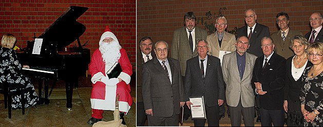 Der Nikolaus sagte leise Servus Links: Nikolausabschied, rechts: Ehrungen beim MGV Liederkranz Eberbach: Gerald Ernst (1. Vorsitzender Sängerbezirk), Helmut Lumpp (40 Jahre Chorgesang), Eckart Sprenger (25 Jahre Chorgesang), Antonio Frezzato und Peter Schäfer (jeweils 15 Jahre)(hinten v. l.), Wolfgang Haag (2. Vorsitzender Sängerbezirk), Karlheinz Sigmund (60 Jahre förderndes Mitglied), Gerhard Kohrmann (50 Jahre Chorgesang), Heinrich Wild und Alois Müller (je 15 Jahre), Gertraude Messing (in Vertretung ihres Mannes Kurt, 15 Jahre), Chorleiterin Karin Conrath (vorne v. l.)