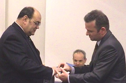 Karl Link 15 Jahre im Gemeinderat Bürgermeister Bernhard Martin (r.) überreicht Karl Link den Ehrenring. (Foto:Richter)(hr) Fast auf den Tag genau seit 15 Jahren ist Karl Link Mitglied des Eberbacher Gemeinderats. Aus diesem Grund wurde ihm heute in Anerkennung seiner ehrenamtlich erworbenen Verdienste der Ehrenring der Stadt Eberbach überreicht.