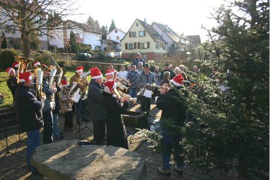 Weihnachtsstimmung im Kleinen Odenwald Die Musikkapelle "Kleiner Odenwald Allemühl" erfreute auch in diesem Jahr an Heiligabend zahlreiche Besucher mit Weihnachtsliedern. (Foto: Böhm)(ub) Was in vielen Familien schon in Vergessenheit geraten ist, wird im "Kleinen Odenwald" noch an weihnachtlichem Brauchtum gepflegt. Statt "Jingle Bells" und anderer amerikanischer Lieder werden in allen fünf Schönbrunner Ortsteilen immer an Heiligabend deutsche Weihnachtslieder von der Musikkapelle "Kleiner Odenwald Allemühl" gespielt und zum Mitsingen eingeladen. Viele großen und kleinen Gäste ließen sich bei Glühwein, Kinderpunsch und bei einem kleinen Plausch mit anderen Besuchern auf den Heiligen Abend einstimmen.