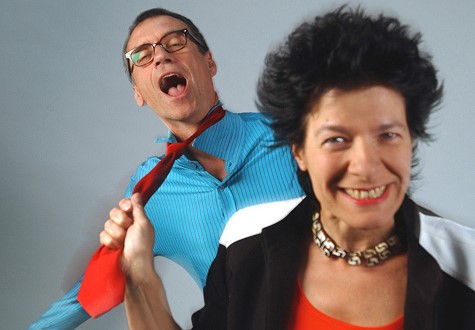 Er, ein Meister an singender Säge und Nasenflöte, haut ihr die Wortspiele um die Ohren. Sie, die Frau mit Rhythmus im Blut und in den Beinen, kontert schlagfertig mit Leder-Rock-Musik.