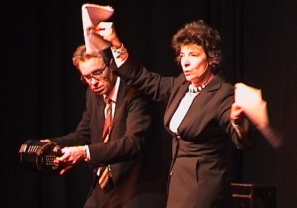 Schwindelerregende Wortgefechte (Foto:Richter)(hr) Das Kabarett-Duo "Faltsch Wagoni" gastierte gestern mit seinem Programm "Deutsch ist dada - und obst!" auf Einladung des Kulturlabors in der Galerie Artgerecht. Vor zahlreich erschienenen Publikum drehten Silvana Prosperi und Thomas Busse die deutsche Sprache so richtig durch die Mangel. Was dabei herauskam, zeugte von Witz, enormer Kreativität und musikalischem Können. Die beiden kramten tief im deutschen Wort- und Grammatikschatz und lieferten sich schwindelerregende Wortgefechte voller Doppeldeutigkeiten und hintergründigem Humor.