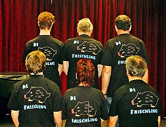 Kabarettgruppe der VHS Eberbach-Neckargemünd (Foto: VHS)(bro) (vhs) Am Samstag, 20. Januar, 20 Uhr präsentiert die neu gegründete Kabarettgruppe der VHS Eberbach-Neckargemünd zum zweiten Mal ihr erstes Programm in leicht veränderter Fassung im Großen Saal der VHS (Bussemerstr. 2a) in Eberbach der interessierten Öffentlichkeit. Di Frischling griffen nach dem Wahrzeichen der Stadt Eberbach als Namensgeber für die Gruppe. Di Frischling, mit zur Zeit sieben Akteure, arbeiten seit zwei Jahren zusammen. Im abendfüllenden Programm wird herrlich gekurpfälzert oder besser gar geeberbachert, was das Zeug hält. Die Sketche "Im Baumarkt" und "Wie ich zum Kabarett kam" stehen hier nur stellvertretend für zahlreiche witzige wie auch nachdenkliche Programmpunkte. Sämtliche Texte haben die Mitwirkenden selbst erarbeitet und einstudiert. Die Gruppe verwaltet sich selbst. Ganz erstaunlich ist die gewaltige Stimmkraft aller Beteiligten und das musikalische Talent. Man wird sich auf einen Abend mit zahlreichen lokalen Anspielungen freuen können.