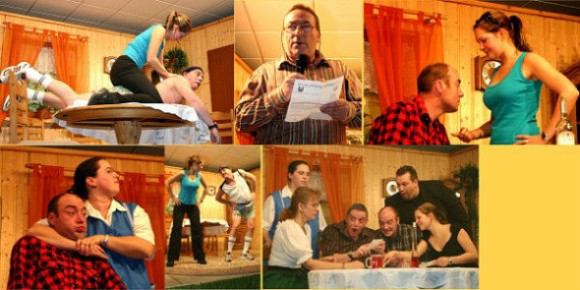 Theatergruppe Babbelwasser wieder in Höchstform MGV- Vorsitzender Erhard Zimmermann (oben Mitte) begrüßte die Gäste zur Winterfeier. Die Zuschauer johlten bei der hervorragenden Aufführung des Lustspiels "Ziemlich nackt im Dicotakt" oder "Schwing die Hüften,Alois!". (Fotos: Böhm) (ub) Brillant und professionell -wie in den vergangenen Jahren auch- präsentierte die Theatergruppe "Babbelwasser" bei der diesjährigen Winterfeier des MGV 1878 "Eintracht" Schönbrunn im Bürgersaal ihr neuestes Theaterspiel "Ziemlich nackt im Discotakt" und erntete pausenlos Lachsalven vom Publikum.