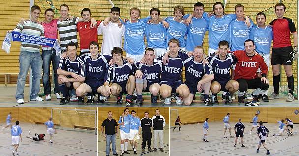 Vierter Sieg in Folge für SpVgg Neckarsteinach beim Eberbacher Turnier Die Endspielmannschaften (Neckarsteinach stehend) sowie Endspielszenen und Pokalübergabe mit den Vertretern des SV Eberbach und Miros´s Hair Point. (Fotos:Claussen)(jc) Die SpVgg Neckarsteinach ist beim Eberbacher Hallenfußballturnier seit vier Jahren eine Klasse für sich. Auch bei der 20. Auflage des Turniers gewannen die Kicker aus dem hessischen Neckartal in einem einseitigen Endspiel am Abend gegen den FC Hirschhorn. Der Sieger des Jahres 2003 war im Finale chancenlos und unterlag mit 2:5. Zuvor hatten die Hirschhorner dem SV Eberbach einen Strich durch die Rechnung gemacht nach vielen Jahren wieder einmal ins Finale einzuziehen. Hängende Köpfe gab es deshalb nach der 1:2- Schlappe bei den Eberbacher Spielern und den Fans auf den voll besetzten Tribünen der Hohenstaufen Sporthalle. Den Frust schoss man sich "kleinen" Finale von der Leber, als man den SV Beerfelden mit 6:2 besiegte. Beerfelden hatte sein Halbfinale gegen Neckarsteinach zuvor mit 3:0 verloren.