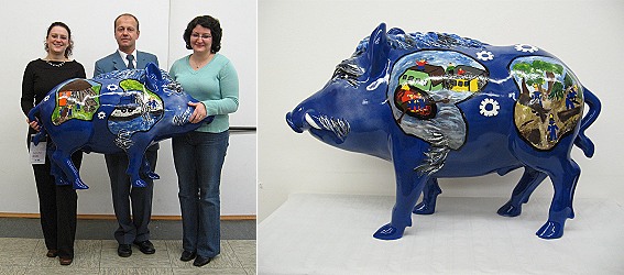 T.H.Weber gehört nun zum THW-Team Links: Spenderin Sarah Schwinn (li.), Ortsbeauftragter Ulrich Schaffer und Christina Fried (re.) mit dem THW-Eber. Rechts: Die linke Seite des THW-Ebers zeigt einen Hochwassereinsatz mit dem Schlauchboot und die Aufarbeitung von Sturmholz. (Fotos: privat)(bro) (als) Am 12. Januar wurde ein mit THW-Motiven gestalteter Eber aus der Aktion "101 Eber" an das Technische Hilfswerk in Eberbach übergeben. Der Eber-Rohling mit der Nummer 107 wurde von Sarah Schwinn an den Ortsverband Eberbach gespendet. Sie ist bereits lange Zeit eng mit dem THW in Eberbach verbunden. Ortsbeauftragter Ulrich Schaffer und der Beauftragte für Öffentlichkeitsarbeit Alessandro Silvestri überlegten lange über ein geeignetes Motiv für den Eber-Körper. Schließlich entschied man sich für eine Gestaltung in THW-Farben und wollte die genaue Motivauswahl der Gestaltenden überlassen. Mit Christina Fried konnte eine Künstlerin für die Bemalung des Ebers gefunden werden. Sie hatte bereits im Kunstunterricht des Hohenstaufengymnasiums an einem der Xavier-Naidoo-Eber mitgearbeitet. Als Vorlage für die aufgebrachten Zeichnungen dienten zahlreiche Fotos aus dem Archiv des THW OV Eberbach, insgesamt vier typische Einsatzszenarien wurden ausgewählt. Zu sehen sind die Hochwasserrettung mit einem Schlauchboot, Aufarbeitung von Sturmholz mit der Motorsäge, das Abstützen eines einsturzgefährdeten Gebäudes und eine neue Hochleistungspumpe, die dem Ortsverband im April 2006 übergeben wurde. Die blaue Grundfarbe bekam der Eber nach dem Aufzeichnen der Motive aus einer Sprühdose, ehe Haaransätze und andere Bereiche mit dem Pinsel, weißer Farbe und viel Geduld abgesetzt wurden. Pünktlich zur Eber-Parade am Apfeltag war der Eber dann auch lackiert und konnte ausgestellt werden. Den THW-Helfern wurde der Eber an diesem Tag als Überraschung präsentiert, alle waren begeistert von dem gelungenen Gesamtbild. Getauft wurde der Eber auf dem Namen "T.H.Weber", um direkt mit dem Namen auf das THW zu verweisen. Ortsbeauftragter Ulrich Schaffer dankte sowohl Spenderin Sarah Schwinn als auch Künstlerin Christina Fried. Für die vielen Arbeitsstunden erhielt die Gestalterin ein neues Handy überreicht. Der Eber schmückt nun den großen Sitzungssaal in der Eberbacher THW-Unterkunft und wird auch im Rahmen von Öffentlichkeitsarbeits-Aktionen zu sehen sein.
