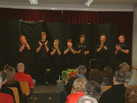 Sei da alle do "Di Frischling" (v.l.) Dieter Moschny, Markus Fochler, Edith Güntner, Rita Fürneisen, Wastl Bachl, Paul Schuh und Per Klausa. Nicht auf dem Bild, weil hinter den Kulissen ist Karl Fürneisen, der sich bei der Truppe um die Technik kümmert. (Foto:Wörner)(tw) Praktisch ein Heimspiel hatten "Di Frischling" unter der Leitung von Rita Fürneisen am Samstagabend im großen Saal der VHS in Eberbach. Genau hier haben sie doch auch in einem Kurs der Volkshochschule in der Kabarettgruppe erste Gehversuche in Sachen Kabarett gemacht. Die Tatsache dass auch jede Menge Freunde und Bekannte gekommen waren, schuf eine private und vertraute Atmosphäre, machte die Akteure andererseits jedoch sicher noch ein Stück nervöser als sonst. Aber Lampenfieber gehört ja bekanntlich zum "Geschäft".