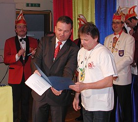 (jc) Im Rahmen der ersten Sitzung des Rockenauer Karnevalsvereins "Club Eulenspiegel" wurden am vergangenen Samstag traditionsgemäß verdiente Persönlichkeiten mit Orden, Titeln und sonstigen Fastnachtstrophäen geehrt. Neben der Ernennung Anton Huy´s zum „Ehrenelferrat“ kam insbesondere Peter Schäffler zu närrischen Ehren. Aus den Händen von Bürgermeister Bernhard Martin empfing er den „Lachenden Eber.