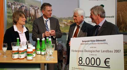 Pionierleistung ausgezeichnet Das Kurgestüt Hoher Odenwald ist diesjähriger Preisträger des Förderpreises Ökologischer Landbau, der von der Bundesregierung unterstützt wird. Unser Foto entstand bei der Übergabe des Preises und zeigt u.a. Gudrun Zollmann (links) und Hans Zollmann (rechts). (Foto:privat)(tb) (kgho) Das Kurgestüt Hoher Odenwald ist diesjähriger Preisträger des Förderpreises Ökologischer Landbau, der von der Bundesregierung unterstützt wird. Der Stutenmilchproduzent erhielt den mit 8.000 Euro dotierten 2. Preis, den Bundesminister Horst Seehofer im Rahmen der Grünen Woche in Berlin feierlich verlieh. Die Jury unter Vorsitz von Dr. Helmut Röscheisen vom Deutschen Naturschutzring belohnte den Demeter-Betrieb für seine Pionierarbeit in der Erzeugung, Verarbeitung und Vermarktung von Biostutenmilch und ihren Produkten. Die Nachkommen von Stutenmilchpionier Rudolf Storch sehen darin auch die Anerkennung seiner 1959 geborenen Idee.