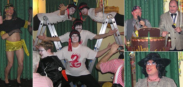Chinesischer Staatszirkus bei der KG Urmel Ein Highlight war der Auftritt der "Flying dragons from little Wimmersbach China-Town" (Mitte), links daneben eine "Grazie aus Ägypten", rechts oben Hans-Georg Hold und Bernhard Walter (v.l.), darunter Karl Beisel als Kreuzfahrerin. (Fotos:privat)(hr) (her) Gestern Abend um 19.31 Uhr startete die KG Urmel ihre erste Sitzung der närrischen Kampagne im voll besetzten Vereinslokal "Bergstübel". Präsident Joachim Schwab begrüßte die Gäste mit einigen Späßen. Nach dem Einmarsch der Elferräte übergab Schwab das Mikrofon an Sitzungspräsident Bernhard "Lungo" Walter.