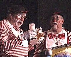Närrische Stimmung im Biergarten der KG Kuckuck Links die "Hallodries", daneben Sabine Baier und Katja Mongin-Müller von den Gässelspatzen (oben, v.l.), unten Barbara und Rainer Menges, rechts "Falco meets Amadeus". (Fotos:Richter)(hr) Mit einem närrischen Fünf-Stunden-Programm startete gestern Abend die Eberbacher Karnevalgesellschaft Kuckuck (KGK) in der Stadthalle die Reihe ihrer diesjährigen Prunksitzungen. Fast 250 Aktive, allesamt aus eigenen Reihen, hatten für den karnevalistischen Kraftakt teils monatelang geprobt, um ihr Publikum aufs Beste zu unterhalten.