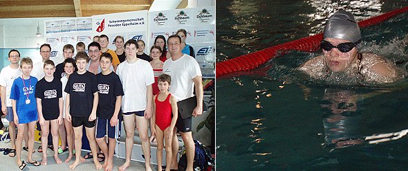 Jeweils vier Goldmedaillen für Nils Braun und Moritz Schöpf Links: Die erfolgreiche Mannschaft des TVE Schwimmen, rechts: Marlene Schöpf auf Goldkurs. (Fotos: privat)(bro) (wh) Tropische Temperaturen herrschten am vergangenen Samstag bei den Kreisjahrgansmeisterschaften im Schwimmen in Eppelheim. Neben dem ausrichtenden Verein, der Poseidon Eppelheim, nahmen noch weitere neun Vereine aus dem gesamten nordbadischen Raum teil. Mit 941 Meldungen wurde das Eppelheimer Hallenbad zum Hexenkessel für die aktiven des TVE. Mit 17 aktiven Schwimmern und 56 Einzelstarts musste sich die Wettkampfgruppe des TVE unter anderem gegen die starke Konkurrenz von Nikar Heidelberg und Neptun Leimen behaupten. Um so erfreulicher war das gute Abschneiden von Nils Braun und Moritz Schöpf. Beide konnten sich gegen ihre Mitstreiter erfolgreich in Szene setzen und wurden bei vier Starts jeweils Kreisjahrgansmeister in ihrem Jahrgang. Beeindruckend waren die Läufe, bei denen der frühere Eberbacher Philipp Uhrig (Poseidon Eppelheim) auf seine ehemaligen Vereinskollegen traf. Bei diesen Läufen wurde der Klassenunterschied zwischen einem Kaderschwimmer und einem Kreisklassenschwimmer deutlich.