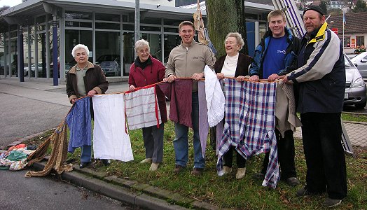 Schmutziger Donnerstag – Eine Tradition wird fortgeführt V.l. Näherin Anni Helm, Susanne Zimmermann, Helfer Markus Scheurich, Oma Erika Müller und Benjamin Müller mit Vater Günter Müller. (Foto:privat)(hr) (bm) Schon seit vielen Jahren wird die Tradition gepflegt, am "Schmutzigen Donnerstag" die Wäsche aufzuhängen. Auch in diesem Jahr spannt die Familie Müller in Eberbach die Wäsche über die Friedrichsdorfer-Landstraße und über die Hohenstaufenstraße.