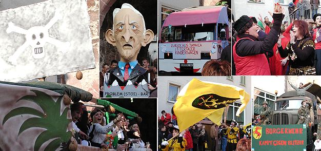 Rathaus-Putzkolonnen und Spenden sammelnde "Stadtsäckel" zogen durch die Gassen. Höhere Hallengebühren beschäftigten die Gemüter ebenso, wie kommunale Blitzanlagen. Gegen die neue kommunale Einnahmequelle hatte sich sogar eine Bürgerwehr formiert. Neben den lokalen Themen kamen die erwarteten Motive wie Edmund Stoibers "Problembär", das Elterngeld und die Fußball WM natürlich nicht zu kurz. Ein knappes Dutzend Kapellen unter den 105 ausgewiesenen Zugnummern sowie zahlreiche gut gelaunte Fußgruppen sorgten auch in diesem Jahr insgesamt für ein bunt gemixtes Spektakel. Von den Kommentatoren Hans-Jürgen Waibel und Doris Heckmann wurden die einzelnen Nummern vor dem Rathaus ausgiebig vorgestellt. Dort ging es dann direkt nach dem Umzug an den Getränkeständen und später in den Kneipen noch ausgelassen weiter.