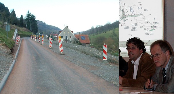 Nochmal ein halbes Jahr Vollsperrung in Sensbachtal Die Baustelle in Sensbachtal, rechts Arno Krämer vom ASV Bensheim und Bürgermeister Manfred Heiss (v.l.) vor einer Darstellung des künftigen Straßenprofils. (Fotos:Richter)(hr) Kein Thema bewegt die Gemüter in Eberbachs hessischer Nachbargemeinde Sensbachtal mehr als die Dauerbaustelle auf der Ortsdurchfahrt zwischen Unter- und Ober-Sensbach. Auslöser für den Straßenbau war vor über 13 Jahren der Einsturz einer Stützmauer durch Hangwasser. Am Morgen des 21. Dezember 1993, als sich nach tagelangem Dauerregen in Eberbach ein "Jahrhunderthochwasser" anbahnte, rutschte in Sensbachtal ein Fahrbahnteilstück der L 3120 ab. In den Folgejahren war die Stelle nur einspurig passierbar.