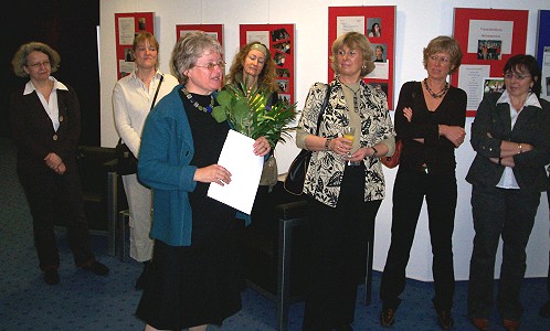 Ausstellungseröffnung in der Volksbank Neckartal in Neckargemünd Die Koordinatorin der Frauenakademie, Renate Sperling (3.v.l.), und Zuschauerinnen. (Foto: privat).