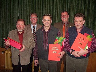 Dr. Michael Reuter nahm gemeinsam mit dem Vorsitzenden Thomas Ihrig weiterhin die Ehrung von langjährigen Mitgliedern vor. Rudolf Brandel, Franz Kral und Jürgen Thanel konnten hierbei jeweils für 40-jährige Mitgliedschaft geehrt werden. Beide dankten den Geehrten dafür, dass sie alle drei in den vergangenen Jahrzehnten auch in den verschiedensten Funktionen in der Gemeinde Hesseneck und im Vereinswesen an hervorgehobener Position im gesellschaftlichen Leben Verantwortung übernommen haben. Neben einer Ehrenurkunde erhielten die Jubilare ein Getränkepräsent. Ebenfalls 40 Jahre ist Josef Pollak in der SPD Hesseneck; da dieser nicht anwesend sein konnte, wird seine Ehrung zu einem späteren Zeitpunkt nachgeholt.