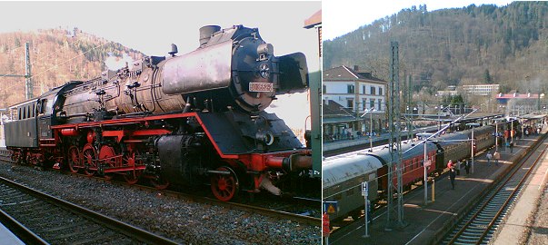 Nostalgiezug im Eberbacher Bahnhof (Fotos:Richter)(hr) Einern historischen Dampfzug gab es heute auf dem Eberbacher Bahnhof zu bestaunen. Der Verein "Museumseisenbahn Hanau e.V." hatte zu einer Sonderfahrt von Hanau über Aschaffenburg, Walldürn, Neckarelz nach Eberbach eingeladen, wo die Gäste zwei Stunden Aufenthalt hatten.