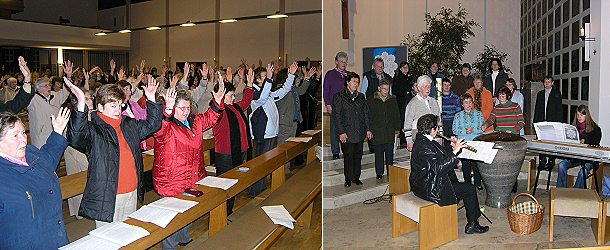Unter Gottes Zelt vereint Links: "Unter Gottes Zelt vereint" feierten Eberbacher Frauen mit Leib und Seele den Weltgebetstag in der Kirche St. Josef, rechts: Die Instrumentalgruppe und der Chor unter der Leitung von Erika Hils (sitzend mit Flöte) begleiteten die Lieder aus Paraguay. (Fotos: Nolten-Casado)(bro) (bnc) Ein blaues Tuch, zeltdachartig über dem Eingang drapiert, hieß die Besucherinnen des Weltgebetstages am Freitagabend in der katholischen Kirche St. Josef in Eberbach-Nord willkommen, ließ sie eintreten in das Zelt Abrahams und Sarahs, deren alles verändernde Begegnung mit Gott im Mittelpunkt des diesjährigen Gottesdienstes stand. Frauen aus Paraguay haben die Gebetsordnung entworfen, haben ihre Geschlechtsgenossinnen in über 170 Ländern eingeladen, ihre Anliegen, ihre Sorgen und Nöte gemeinsam mit ihnen vor Gott zu bringen. Wie die verschiedenen Muster der kunstvoll gefertigten paraguayischen Ñandutí-Spitze durch einen einzigen Faden zu einem Ganzen vereint werden, so sollten Frauen aller Länder und Konfessionen diesen Abend in gegenseitiger Verbundenheit "unter Gottes Zelt vereint" miteinander verbringen.
