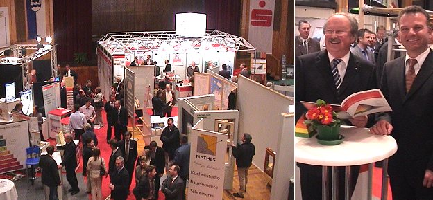 Leistungsschau des regionalen Baugewerbes Die Stadthalle hat sich in eine Messehalle verwandelt. Rechts Sparkassendirektor Gerhard Stock und Bürgermeister Bernhard Martin (v.l.) beim ersten "Messerundgang". (Fotos:Richter)(hr) Für Messeflair in Eberbach sorgt von morgen bis Sonntag die große Bau-Ausstellung "Schöner wohnen - Umwelt schonen". In der Stadthalle und auf dem Leopoldsplatz bieten rund 40 Aussteller eine umfassende Leistungsschau des regionalen Baugewerbes.