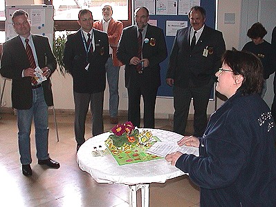 300 junge DLRG-Gäste in Eberbach Nicole Schröder beim heutigen Empfang mit Bürgermeister Bernhard Martin (l.), Landespräsident Norbert Sy (2.v.l.) und dem Eberbacher DLRG-Vorsitzenden Heinz Thöne (4.v.l.). (Foto:Richter)(hr) Seit gestern veranstaltet die DLRG-Jugend Kurpfalz ihr Bezirkskinder- und -jugendtreffen mit Bezirksmeisterschaften im Rettungsschwimmen in Eberbach. Rund 300 Kinder und Jugendliche aus dem Bezirksgebiet sind dafür in die Stadt gekommen. Übernachtet wird in der Dr.-Weiß-Schule, dort finden auch verschiedene Workshops statt. Verpflegung vom DRK gibt es in der Mehrzweckhalle, wo man sich heute Abend auch zu einer Party trifft. Heute und morgen werden die Wettkämpfe im Hallenbad und in der DLRG-Station mit der Disziplin Herz-Lungen-Wiederbelebung durchgeführt. Über die Ergebnisse werden wir noch berichten.