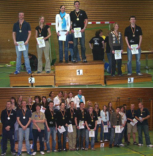 Auf dem unteren Bild sind die Sieger in der offenen Altersklasse zu sehen: männlich 1. Platz Gruppe Schwetzingen, 2. Platz: Gruppe St. Leon, 3. Platz Gruppe Eberbach 1 (von ganz rechts: Eric Wolff, Marius Sauerborn, Dominik Deschner, Sebastian Vetter, Axel Wilbertz), weiblich 1. Platz Gruppe Neckargemünd, 2. Platz Gruppe Schwetzingen, 3. Platz Gruppe St. Leon.