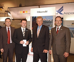 Internationalen Tourismus-Börse in Berlin Verbandsdirektor Stefan Dallinger von der Metropolregion Rhein-Neckar, Landrat Dr. Achim Brötel, Wirtschaftsminister Ernst Pfister und TGO-Geschäftsführer Achim Dörr (v.l.). (Foto: privat)(bro) (sch) Reichlich politische Prominenz - Verbandsdirektor Stefan Dallinger von der Metropolregion Rhein-Neckar, Landrat Dr. Achim Brötel, Wirtschaftsminister Ernst Pfister und TGO-Geschäftsführer Achim Dörr - stattete dem Stand der Touristikgemeinschaft Odenwald (TGO) bei der Internationalen Tourismus-Börse ITB in Berlin einen Besuch ab. Aber auch "Otto Normalverbraucher", der an zwei der fünf Messetage Zugang hatte zu dieser führenden Fachmesse, zeigte sich sehr interessiert am "Genießerland Baden-Württemberg" - so das diesjährige Motto – und an den Angeboten der TGO als "kleinem, aber feinem Teil dieses Genießerlandes". Tatsächlich war "Genuss" auch bei der TGO angesagt: beim Radeln, bei der Kultur, beim Wandern oder beim Essen, für alle Interessen gab es entsprechende Tipps und Pauschalangebote.