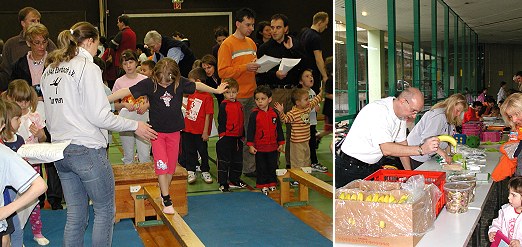 Kinder-Turntest der Barmer Ersatzkasse und des TV Eberbach Nach den anstrengenden Übnungen gab es gesunde Snacks (Fotos:Claussen)(jc) Über 150 Kinder im Alter von 3 bis 10 Jahren nahmen gestern am Kinderturn-Test der Barmer Ersatzkasse und des TV Eberbach in der Ittertal-Sporthalle teil. Der Test ist Teil der Kampagne "Kinderturnen - Die Zukunftschance für eine nachhaltige Bewegungsförderung in Deutschland" von BARMER und Deutschem Turnerbund (DTB). Anhand von sieben Testaufgaben wurden die Fähigkeiten Ausdauer, Kraft, Beweglichkeit und Koordination geprüft und auf einem Ergebnis-Bogen aufgezeichnet. Motorische Stärken und Schwächen der Kinder wurden laut TVE-Übungsleiterin Heide Grimme klar offengelegt. Selbst einfache Körperübungen bereiteten zahlreichen Kindern schon Schwierigkeiten. Eingangs wurden auch die anthropometrische Merkmale Größe, Gewicht und Body Mass Index auf dem Ergebnisbogen verzeichnet. Ergänzend bekamen Eltern Auskunft bezüglich Über- und Untergewicht ihrer Kinder und entsprechende Ernährungstipps. Das Forschungszentrum für den Schulsport und den Sport von Kindern und Jugendlichen (FoSS) unter der Leitung von Prof. Dr. Klaus Bös und Susanne Bappert haben den Test an der Uni Karlsruhe entwickelt. Dort werden die gesammelten Testergebnisse statistisch ausgewertet.