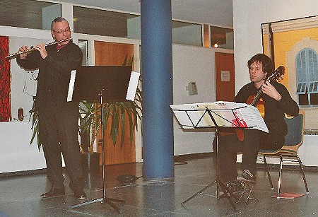 Ein Konzert für Gitarre und Querflöte Martin Schmidt und Peter Mall (v.l.) beim Musizieren im Foyer des Rathauses. (Foto:privat)(ag) Unter dem Titel "Musik des 20. Jahrhunderts aus Lateinamerika und Europa" fand heute die Matinee des Gitarristen Peter Mall von der Musikschule Eberbach und des Querflötenlehrers Martin Schmidt von der Musikschule Mosbach im wohlklingenden Raum des Foyers des Rathauses statt.