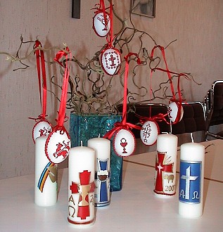 Am Samstag, 31. März, können nach dem um 18.30 Uhr stattfindenden Gottesdienst geweihte Kerzen erworben werden. Diese Kerzen wurden ebenfalls passend zur Osterzeit von den Damen des Handarbeitskreises verziert.