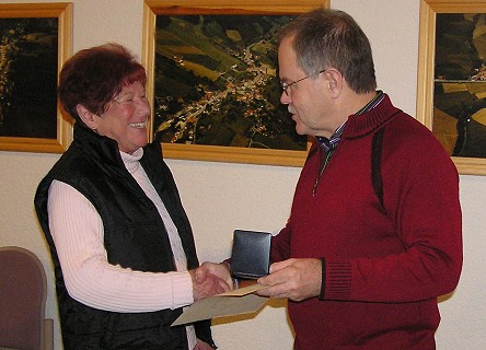 Ulla Ulrich führt jetzt den TSV Sensbachtal an Gisela Oriwal wurde von der Gemeinde Sensbachtal für 40-jährige ununterbrochene Tätigkeit als Übungsleiterin für Gymnastik und Turnen beim TSV Sensbachtal mit der silbernen Verdienstmedaille durch Bürgermeister Manfred Heiss ausgezeichnet. (Foto:privat)(cr) (gh) Bei der kürzlich stattgefundenen Jahreshauptversammlung des TSV Sensbachtal konnten zwei Vorstandsämter nicht besetzt werden, da niemand der anwesenden Mitglieder bereit war, ein Amt zu übernehmen. Das Amt des zweiten Vorstandssprechers sowie ein Mitglied für den Festausschuss müssen in einer weiteren Versammlung gewählt werden. Damit setzt sich der schon seit einigen Jahren anhaltende Trend fort, dass nur wenige Mitglieder bereit sind, verantwortlich im Vorstand des TSV Sensbachtal mitzuarbeiten.
