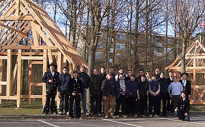 Nun aufgerichtet steh´n, drei schöne Häuser, ihr könnt seh´n… (Foto: privat)(bro) (ff) Mit diesen Worten wurde das zünftige Richtfest für eins von drei Fachwerkhäusern begonnen, welches die Zimmererlehrlinge der Theodor-Frey-Schule mit ihren Kollegen aus Dänemark und Frankreich auf ihrem zweiten Projektreffen abhielten. Das Richtfest war der Abschluss einer gelungenen Woche an der Odense Tekniske Skole (OTS) in Dänemark. Die Planung dieses Projektes hatte bereits im Oktober des letzten Jahres an der TFS in Eberbach begonnen. Die international gemischten Gruppen entwarfen die Baupläne, erstellten die erforderlichen Holzlisten und bauten drei Modelle im Maßstab 1: 10, welche vom 12. bis zum 16. März in Originalgröße erstellt wurden. Ein freudiges Wiedersehen gab es bei der Ankunft am Bahnhof in Odense, nachdem die Eberbacher Gruppe und die Schüler des Institut Européen de Formation aus Mouchard im Jura Frankreichs von den dänischen Kollegen empfangen wurden. Außerhalb der Stadt wurde die Unterkunft in einem geräumigen Ferienhaus auf dem Lande bezogen. Für den Sonntag stand ein Ausflug nach Nyborg, einer Stadt auf dem westlichen Teil der Insel Fynens, auf dem Programm. Die Hauptsaison beginnt erst Anfang April, so dass man das Schloss mit seinem imposanten Wehrturm sowie das Stadtmuseum nur von außen anschauen konnten. Zu Beginn erfuhren die Gäste auf einer Führung durch das riesige Schulgebäude sehr viel Wissenswertes über das dänische Ausbildungssystem im Baubereich. Nach dem Mittagessen, das die ganze Woche über von der TIB, der dänischen Bau-Gewerkschaft, gestiftet wurde, begann man mit den 1:1 Aufrissen und dem Sortieren der Hölzer. Die Arbeiten gingen zügig von der Hand. Die sprachlichen Schwierigkeiten konnten durch die Arbeitssprache Englisch und mithilfe vieler Skizzen gemeistert werden. Schon am Abend waren die ersten Werkzeuge bei der Arbeit. Trotz der Arbeit wollte man auch das Land und die Leute Dänemarks kennen lernen und verbrachte die zweite Hälfte des Mittwochs im Süden der Insel, wo die landestypischen Bauweisen - einstöckige, teilweise mit Reetdach gedeckte, Fachwerkhäuser besichtigt wurden. Der Waldbestand Dänemarks lässt nur eine schlichte Fachwerkbauweise ohne große Verzierungen zu. Diese Bauweisen beschränken sich auf das Wesentliche, jedoch wirken die weißen Gefache zwischen den roten Konstruktionshölzern sehr anmutig und erinnern an die Zeit, als noch die Stammesfürsten und Wikinger diesen Teil Dänemarks beherrschten.
