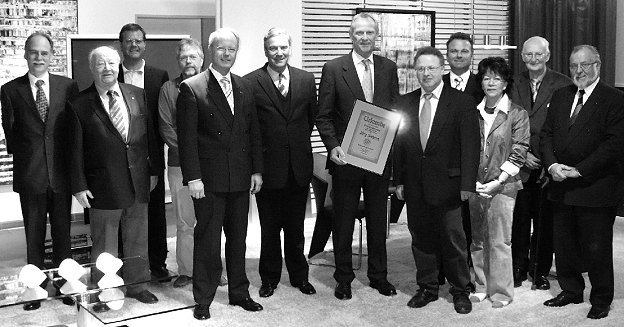 Jörg Siebert wird Ehrenvorsitzender des Kuratoriums der Bürgerstiftung Kuratorium und Vorstand der Bürgerstiftung (v.l.): Dr. Andreas Wiese (Kuratorium), Ronald Schmitt (Gastgeber), Dr. Stefan Ritsert (Kuratorium), Dieter Uhrig (Stiftung Norbert-Köhler-Musikpreis), Herbert Hinterschitt (Vorstand), Gunter Blankenhorn (Kuratorium), Jörg Siebert (Ehrenvorsitzender des Kuratoriums), Dr. Ulrich Rietdorf (Vorsitzender des Kuratoriums), Bürgermeister Bernhard Martin (Vorstand), Renate Lipski (Geschäftsstelle Bürgerstiftung), Helmut Ehret (Kuratorium und "Hedwig und Helmut Ehret Stiftung") sowie Norbert Engert (Kuratorium). (Foto:Grove)(bro) (bg) Im Rahmen eines kleinen Festaktes wurde am 28. März 2007 in den Ausstellungsräumen der Firma Ronald Schmitt Tische Jörg Siebert zum Ehrenvorsitzenden des Kuratoriums der Bürgerstiftung Eberbach ernannt.