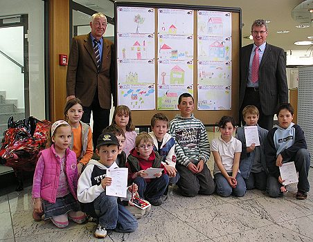 Kreativ-Wettbewerb: Ich male mein Traumhaus (Foto: privat)(bro) Tolle Zeichnungen entstanden beim Kreativ-Wettbewerb: "Ich male mein Traumhaus", der im Rahmenprogramm der diesjährigen Bau-Ausstellung in und um die Stadthalle Eberbach begleitend für die kleinen Ausstellungsbesucher angeboten wurde. Viele "Traumhäuser" gab es zu bestaunen. Die Preisübergabe in der Hauptstelle Eberbach wurde von den beiden Regionaldirektoren Klaus Poser und Karlheinz Emig durchgeführt. Gewonnen haben: Valerie Bauer, Maren Baumgärtner, Ivana Beldermann, Philipp Beldermann, Lena Deschner, Julian Kohler, Marian Kohler, Nico Lenz, Max Leuser, Alexander Schröder, Eduard Schröder und Pavel Skopic.