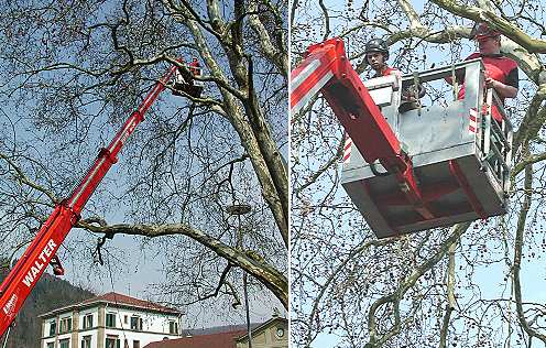 Kronensicherung der Platane am Bahnhofsplatz wurde erneuert Die Mitarbeiter der Baumpflegefirma beim Austausch der Kronensicherung. (Fotos: Bernecker)