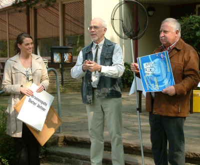 Dieter Jeitner wurde Brunnenpate Nadine Zimmermann vom Bauamt der Stadt Eberbach mit Günter Lipski, dem 1. Vorsitzenden des Bürger- und Heimatvereins und dem frischgebackenen Brunnenpaten Stadtrat Dieter Jeitner mit Ernennungsurkunde und "Brunnenreinigungsgerät". (Foto:Wörner)(tw) In einem kleinen Festakt wurde der Springbrunnen im Park hinter der Stadthalle am Samstagvormittag dem Bürger- und Heimatverein übergeben und bekam gleichzeitig einen Paten.