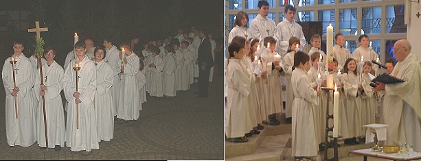 Nach der Lichtfeier, im zweiten Teil des Gottesdienstes der Osternacht, wurden nun verschiedene Abschnitte aus der Heiligen Schrift vorgelesen, in ihnen soll verdeutlicht werden, was Gott für die Menschen getan hat. Verschiedene Fragen der Erstkommunikanten unterstrichen die Bedeutung dieser Schriftlesungen. Nun erklangen auch wieder alle Glocken, die ja seit Karfreitag, dem Todestag Jesu, schwiegen - die Kirche erstrahlte in vollem Licht.