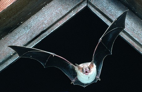 Freie Bahn für die Nachtjäger – Den Garten fledermausfit machen Großes Mausohr (Myotis myotis) ins Quartier (Kirchdachboden) einfliegend.(Foto: NABU, Eberhard Menz)