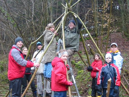 Weidentipi für das Waldklassenzimmer (Foto:privat)(tw) (uk) Ende März trafen sich 20 Kinder der NAJU Kindergruppe, trotz des nass-kalten Wetters, im Gretengrund, um dort nach Indianer-Art ein Weidentipi zu bauen.