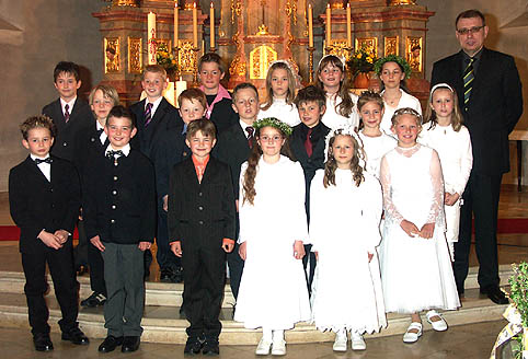 Monatelange Vorbereitung auf die Kommunion in Waldbrunn 21 Mädchen und Jungen nahmen heute zum ersten Mal am Mahl Gottes teil. Unser Foto zeigt die beim Gruppenbild noch anwesenden Erstkommunikanten zusammen mit Pfarrer Ivkic. (Foto: Baumgartner)(tb) Lange hatte man sich vorbereitet und heute war es dann soweit. 21 Waldbrunner Mädchen und Jungen waren zum ersten Mal zur Teilnahme am Mahl Gottes eingeladen. Seit Januar bereiteten sich die Kinder, begleitet von Gruppenmüttern und ehrenamtlichen Gemeindemitgliedern vor, um diesen Tag der Aufnahme in die Gemeinschaft der Christen und der Freundschaft mit Jesus feierlich zu begehen und das Sakrament der Ersten Heiligen Kommunion zu empfangen. So konnten es die Kommunionkinder kaum erwarten, bis sie an "ihrem" Sonntag zusammen mit Pfarrer Ivkic feierlich in die Pfarrkirche St. Maria einziehen konnten.