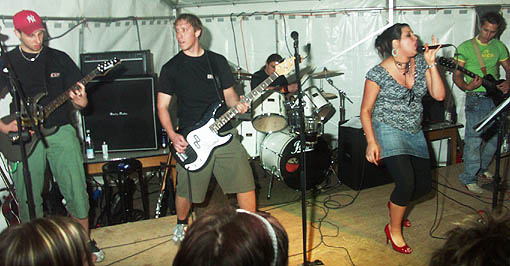 350 Leute bei offizieller Bandpremiere Discast rockten bei der 3. Open-Air Dance-Night des TSV Strümpfelbrunn. (Foto: Baumgartner)(tb) Gestern stieg in Strümpfelbrunn die dritte Auflage der "Open-Air Dance-Night" des TSV Strümpfelbrunn. Mit dabei als Liveact war die Newcomer-Rockband "Discast", die sich aus fünf Jung-Rockern aus Waldbrunn und Eberbach zusammensetzt. Gespannt war man in Strümpfelbrunn die neue Band, die bei ihrem ersten Gig in Eberbach schon für ein wenig Aufsehen sorgte. Laut Angaben des Veranstalters waren rund 350 - meist junge Leute – zur Dance-Night gekommen, um die offizielle Premiere der Band zu erleben, die das Partyvolk am Neckar und im Odenwald aufmischen will. In der Besetzung Thomas Frank (E-Bass, Gesang), Andreas Mathes (Gitarre), Rafael Casado (Gitarre, Gesang), Pascal Bier (Drums) und Frontfrau Marina Galm, präsentierten die Newcomer einen Mix von eigenen Songmaterial bis hin zu Covers von Greenday über Offspring bis hin zu den Onkelz und heizten dem Publikum im aufgebauten Festzelt und den Leuten davor ein. Insbesondere bei "I love Rock’n’roll", dem Klassiker von Joan Jett and the Blackhearts, konnte sich dabei die kürzlich mit dem Norbert-Köhler-Musikpreis ausgezeichnete Marina Galm eindrucksvoll in Szene setzen.